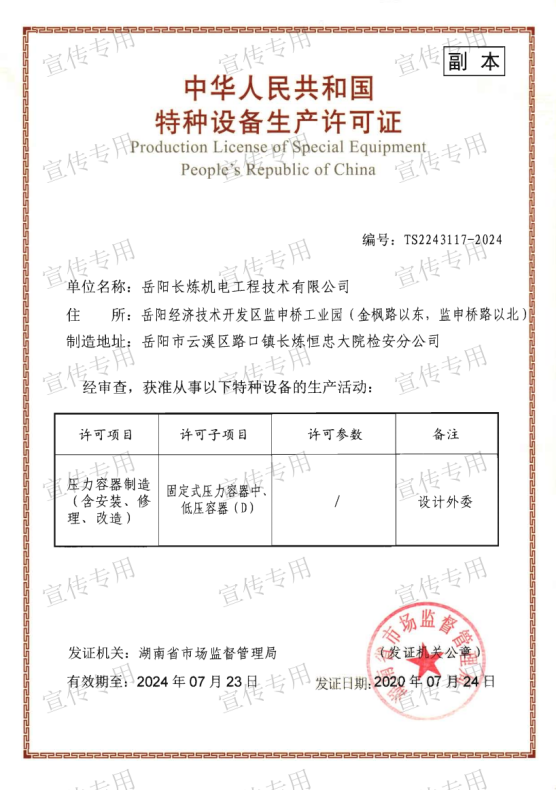 公司擁有石油化工工程施工總承包壹級資質(zhì)、機電工程施工總承包壹級資質(zhì)、檢維修能力評定(9大類38項)、建筑工程施工總承包叁級資質(zhì)、電力工程施工總承包叁級資質(zhì)、環(huán)保工程專業(yè)承包叁級資質(zhì)、消防設(shè)施工程專業(yè)承包貳級資質(zhì)、防水防腐保溫工程專業(yè)承包貳級資質(zhì)、電子與智能化工程專業(yè)承包貳級資質(zhì)、施工勞務(wù)不分等級資質(zhì)、兩化(工業(yè)化、信息化)融合管理體系認證、A級工業(yè)設(shè)備高壓水清洗資質(zhì)、特種設(shè)備生產(chǎn)許可證(中、低壓壓力容器制造(含安裝、修理、改造)(D))、特種設(shè)備安裝改造維修許可證(壓力管道)GC1級、特種設(shè)備安裝改造維修許可證(鍋爐)1級、特種設(shè)備安裝改造維修許可證(起重機械)B級;特種設(shè)備檢驗檢測機構(gòu)核準證(安全閥定期校驗)檢驗項目FD1、FD2、承裝(修、試)電力設(shè)施許可證(承裝類二級、承修類二級、承試類三級)、防爆電氣設(shè)備安裝、修理資格證書、計量標準考核證書的二氧化硫氣體檢測儀檢定裝置、硫化氫氣體檢測儀檢定裝置、熱電偶標準裝置、可燃氣體檢測報警器檢定裝置、精密壓力表標準裝置、一氧化碳檢測報警器檢定裝置等企業(yè)資質(zhì)。公司通過了中國質(zhì)量認證中心QHSE管理體系認證,是中石化施工企業(yè)資源庫A庫成員,湖南省建設(shè)網(wǎng)成員單位,湖南省高新技術(shù)企業(yè)。